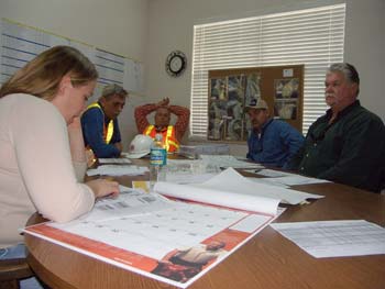 SR-414 Engineer Misty Bayer reviews production quantities with Superintendent Charlie Geiger, Area Manager Pete Scholer, Superintendent Walt Pierce and Area Manager Mark Webber. (Photo by Carl Thiemann)